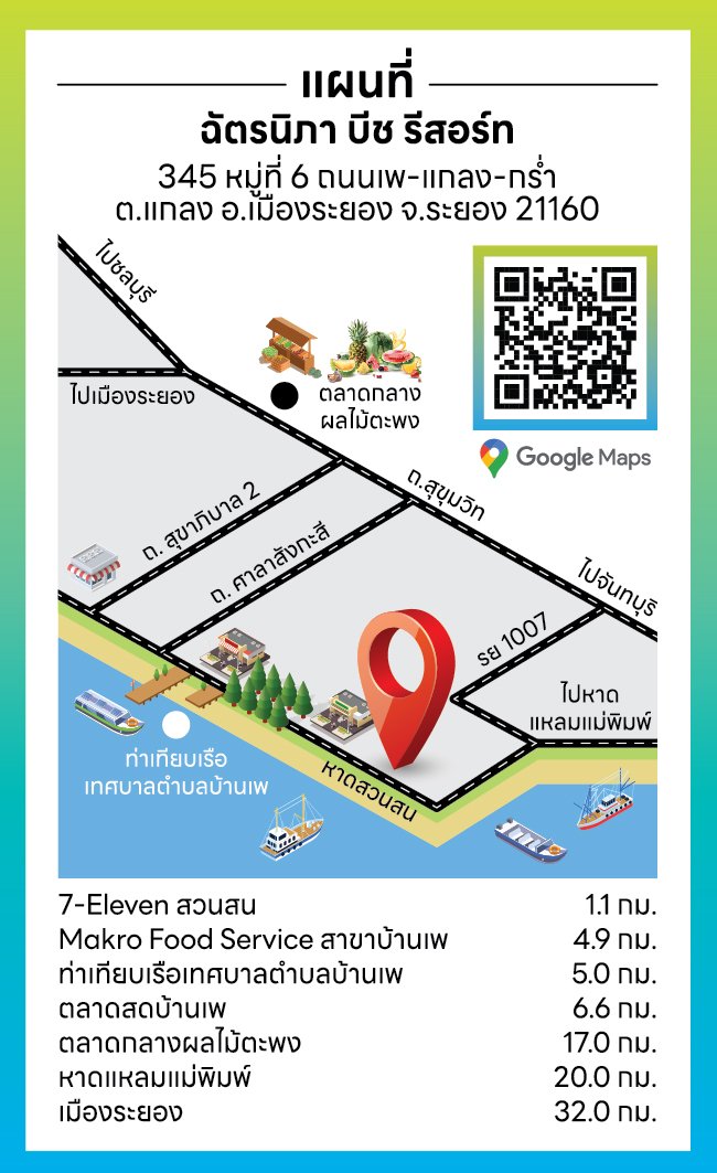 รีสอร์ทแห่งนี้ คือ ที่พักในระยอง ที่เหมาะกับการพักผ่อน และ ยังสามารถเดินทางไปแหล่งท่องเที่ยวต่างๆ เช่น เกาะเสม็ด หาดสวนสน บ้านเพ อุทยานแห่งชาติเขาแหลมหญ้า หาดแม่รำพึง หาดทรายแก้ว หรือ หาดแหลมแม่พิมพ์ เป็นต้น